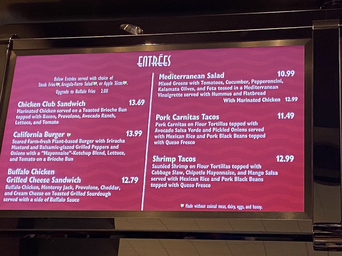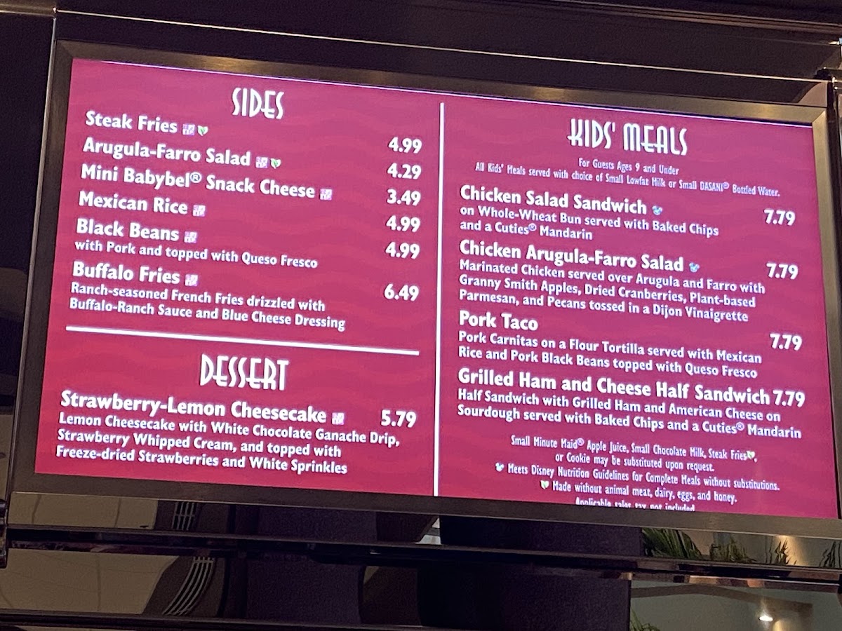 Marinated Chicken served over Arugula and Farro with Granny Smith Apples, Dried Cranberries, Plant-based Parmesan, and Pecans tossed in a Dijon Vinaigrette. Meets Disney Nutrition Guidelines for Complete Meals without substitutions